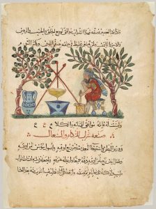 Chemistry: various methods including evaporation, filtration, sublimation, and even distillation. Despite the specific ban on intoxicants in the Koran, it was Abbasid chemists who invented distilled spirits: al-kuhl, meaning “the essence,” from which the English word alcohol derives.