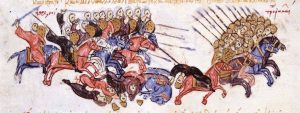 Arab Army chasing fleeing Byzantine army from the battle of Azazion, 13th century https://upload.wikimedia.org/wikipedia/commons/4/4f/The_Arabs_drive_the_Byzantines_to_flight_at_Azazion.jpg